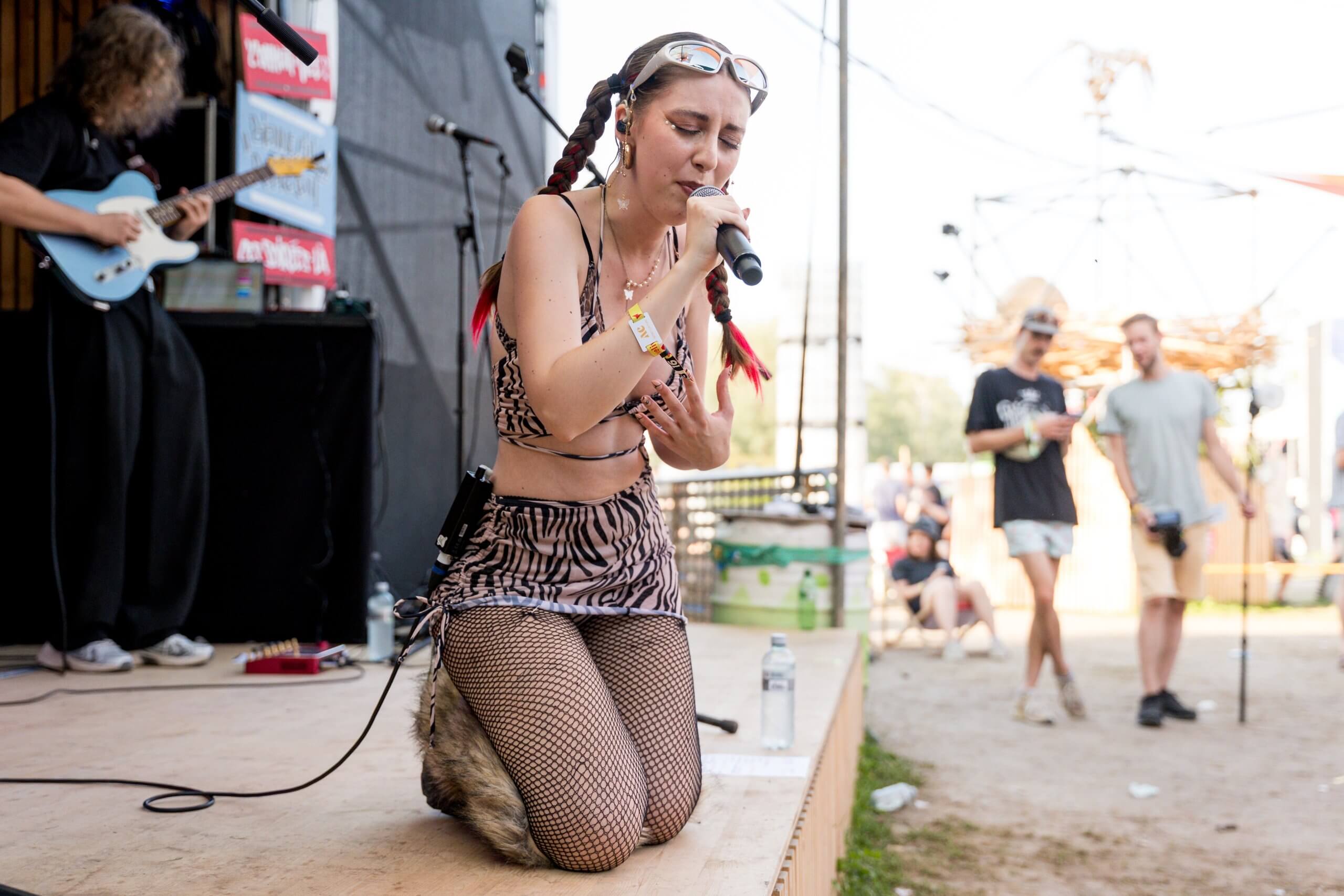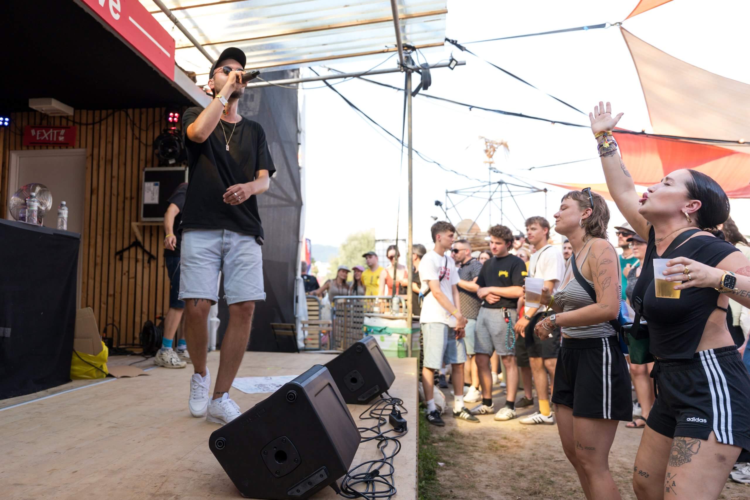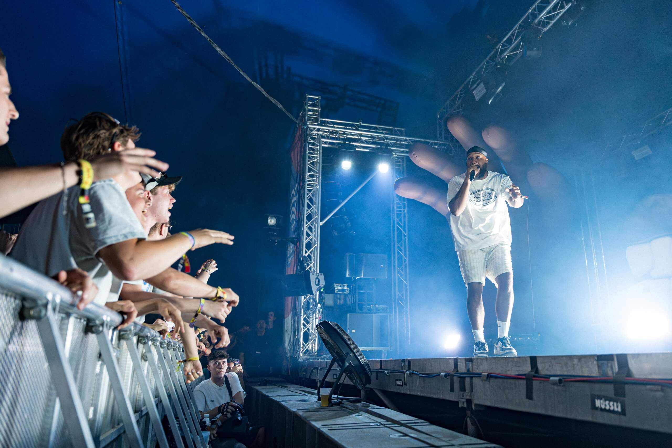 Die Newcomerin Lum hat viel Talent, wie sie zuletzt am SRF-Bounce-Cypher bewiesen hat. Am Freestyle-Event des Hip-Hop-Kanals rappte sie ihren Part in sieben verschiedenen Sprachen. Selbst bezeichnet sie sich als Mischung aus Doja Cat und Rosalia – was zugegebenermassen ziemlich gut passt. Mit viel Energie, gewagten Moves und experimenteller Musik bewegt sich die Lausannerin, die jetzt in Zürich wohnt, über die Container Stage. Und spielt dann sogar den siebensprachigen Cypher-Part. Schade nur, hat es fast kein Publikum: Der Platz direkt vor der Bühne ist gähnend leer, nur ein paar Kinder nutzen ihn für wilde Tanzeinlagen. Lum lässt sich aber nicht beirren, tanzt mit den Kindern und liefert ab. So schaffen es bis zum Schluss doch noch ein paar Erwachsene ganz vor die Bühne.