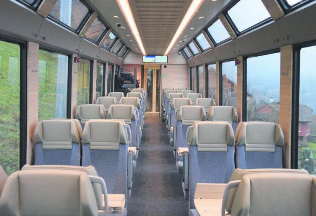 Sitzplätze an der Zugspitze, wie man sie bei den aktuellen Panoramazügen der MOB kennt, wird es in den neuen Zügen nicht mehr geben. Die Passagiere können in der Prestige-Klasse trotzdem die Aussicht durch das Frontfenster bestaunen, indem sie dem Lokführer über die Schultern schauen. Das ist möglich, weil der Führerstand aus Glas und damit transparent ist.