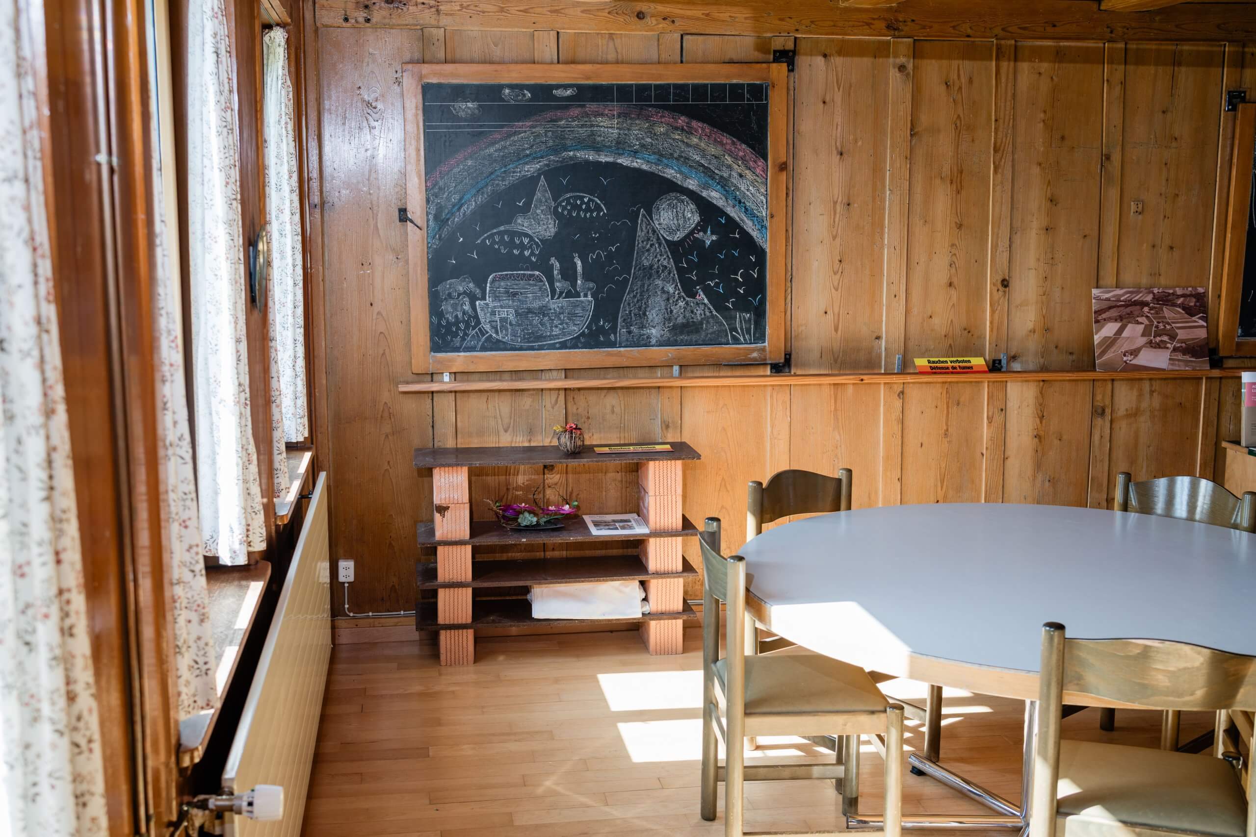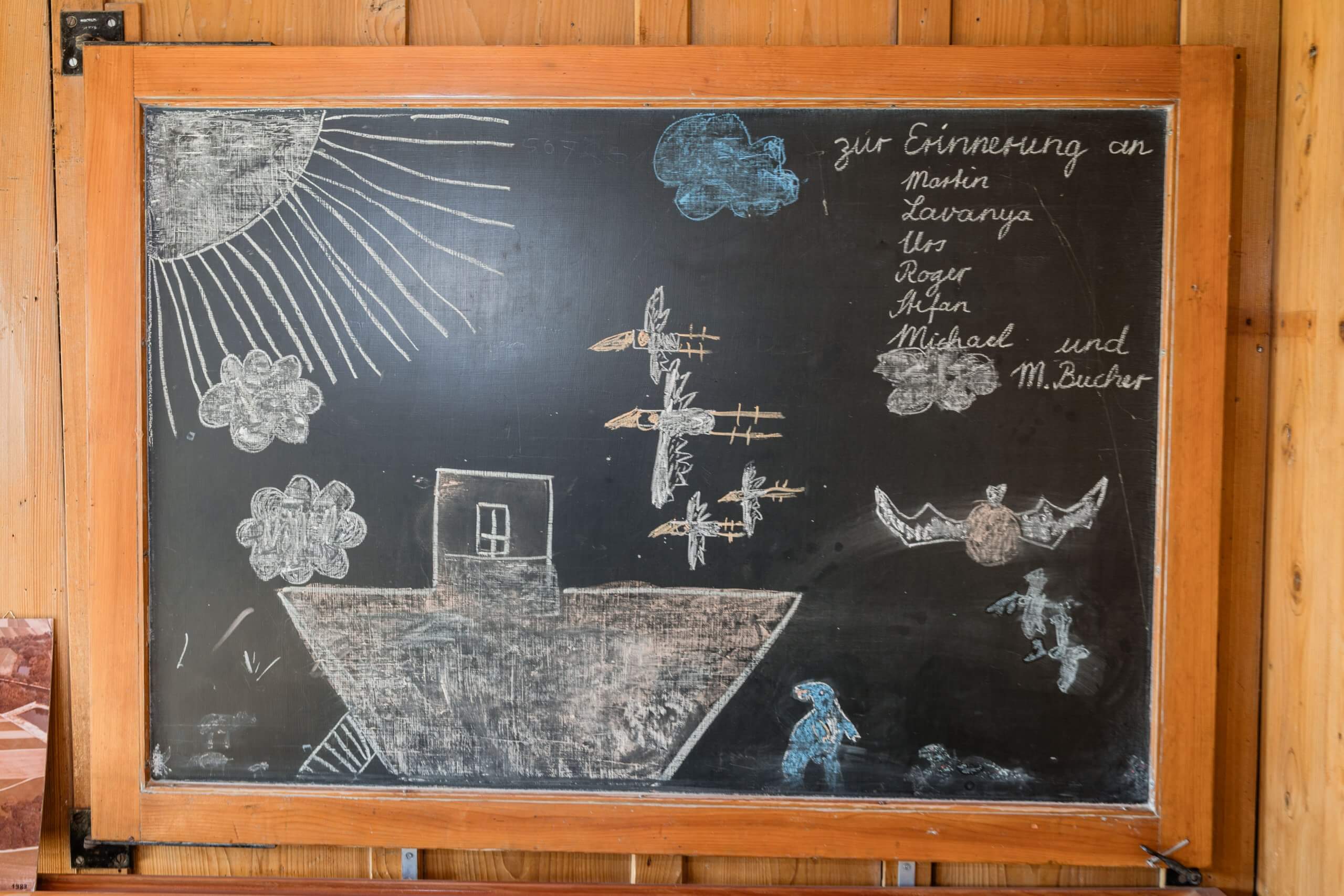 Auf den Wandtafeln im Schulzimmer sind noch Kinderzeichnungen aus späteren Jahren zu erkennen – Überbleibsel aus der Zeit nach der Schulschliessung, als hier noch Einschulungsklassen unterrichtet wurden. Heute tagt die Gemeinde noch immer hier, der Raum bleibt Treffpunkt eines Dorfes, das lange an seiner Schule festhielt.
