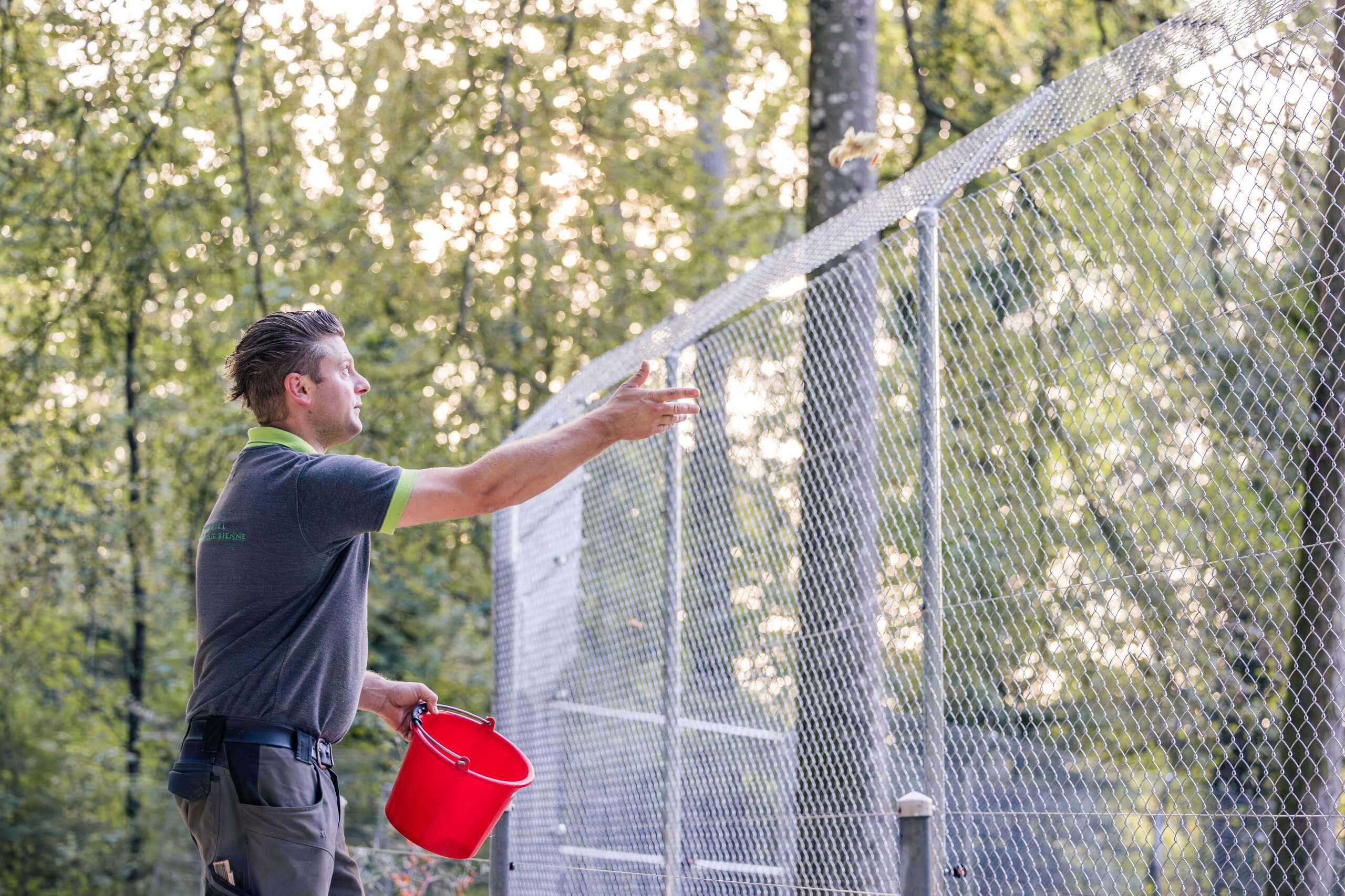 Nun steht die erste Runde durch den Tierpark an. Hess kontrolliert, ob es allen Tieren gut geht und ob alle Zäune intakt sind. Sie beginnt sogleich, das Futter zu verteilen. Als Erstes ist der Waldkauz an der Reihe, er bekommt ein paar Küken. In der Voliere liegt noch ein unangetastetes vom Vortag, dieses wirft Hess in grossem Bogen in das benachbarte Wildschweingehege.