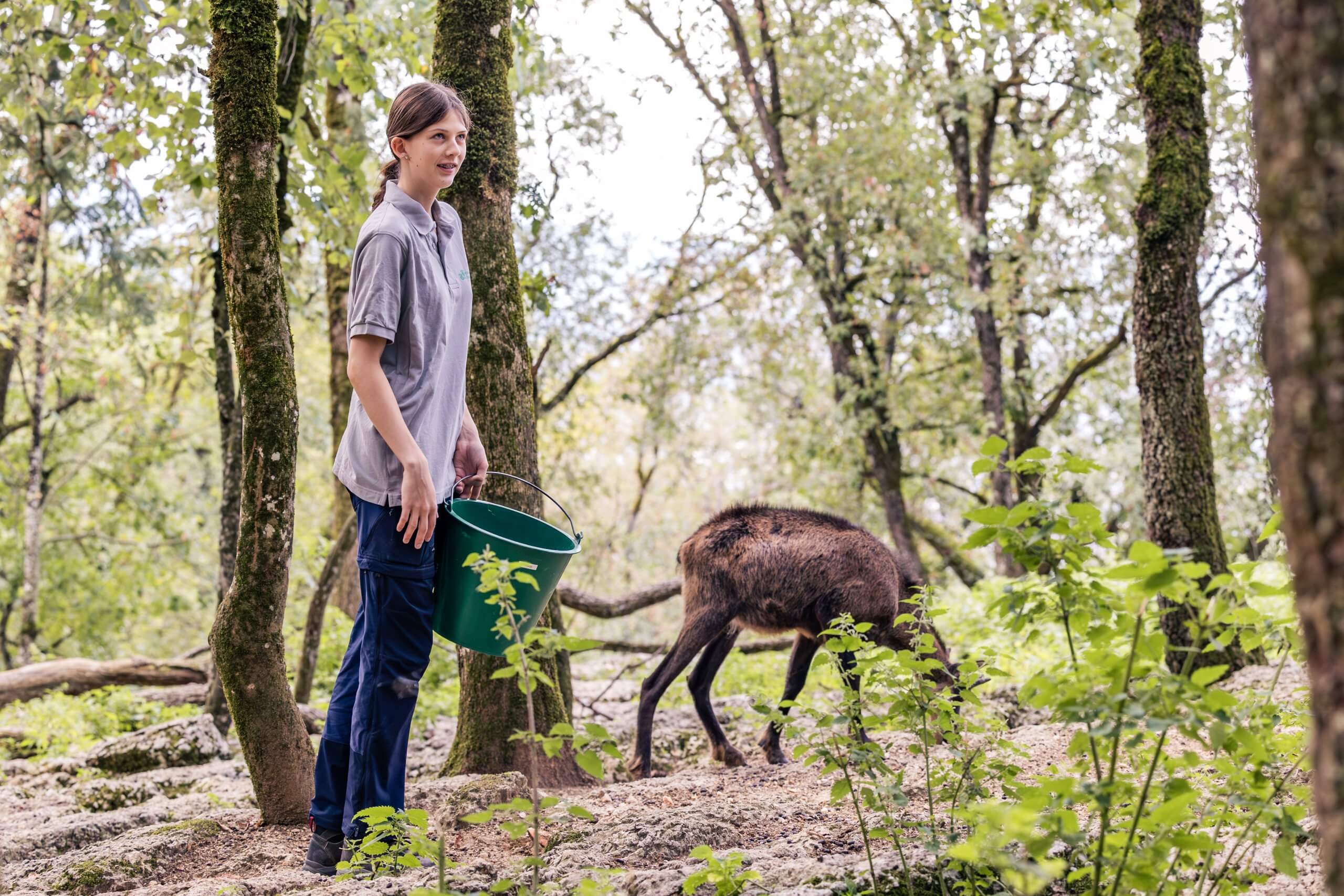 So verteilt Lehrtochter Saskia Hess die Pellets für die Gämsen grosszügig im ganzen Gehege. Einige der Tiere folgen ihr neugierig, andere schauen aus der Distanz zu – auch, als sie einmal dem Zaun entlanggeht, um zu überprüfen, ob dieser überall intakt ist. Spätestens aber, als sie die Gämsen in ihrem Lebensraum wieder alleine lässt, suchen alle Tiere nach den Leckerbissen zwischen Laub, Steinen und Wurzeln.