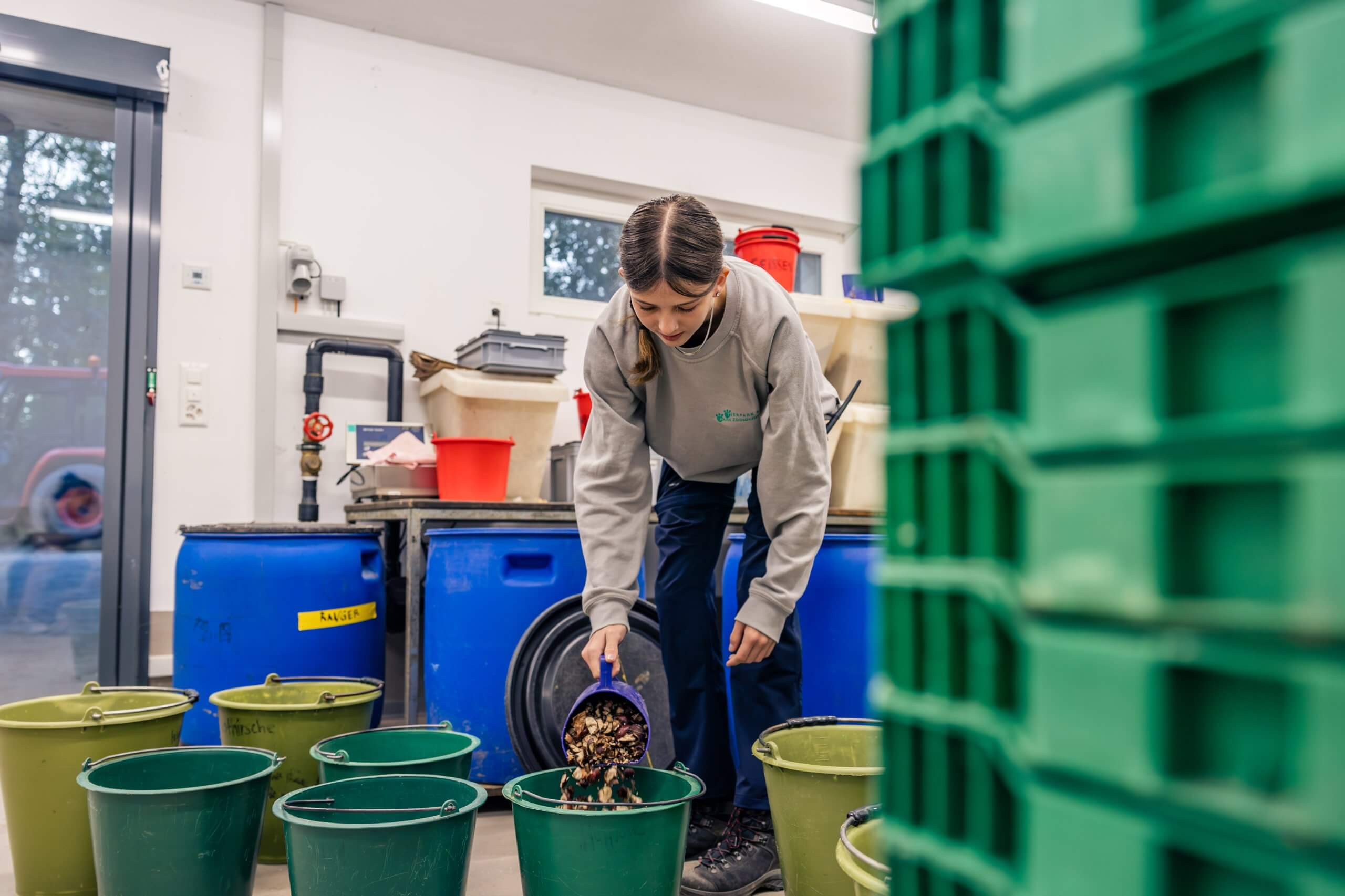 Kurz nachdem sich Fässler an den Pausentisch gesetzt hat, trifft Lehrtochter Saskia Hess ein. Sie macht sich nach kurzer Lagebesprechung mit dem Chef gleich an die Futtervorbereitung.