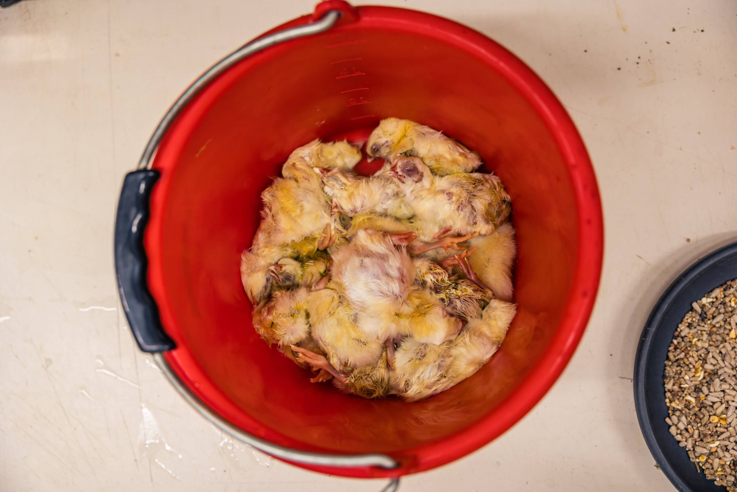Für die Eulen und Raubvögel, die im Tierpark leben, kauft der Park einen Tag alte Hühnerküken an. Diese kommen aus der Eierproduktion: Es sind männliche Tiere, die wenige Stunden nach dem Schlüpfen getötet werden, weil sie nicht als Legehennen taugen.