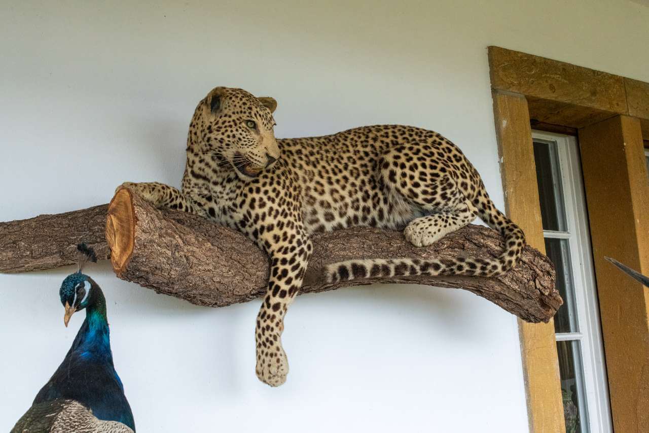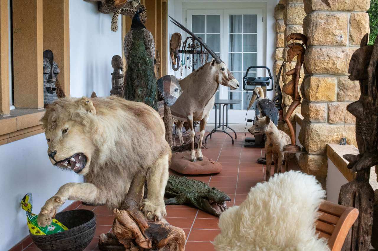 Von oben ruft eine Stimme: «Es gibt Mittagessen.» Es ist Markus Petrigs Frau Barbara. Er erhebt sich und geht die Treppen hoch – nicht ohne noch an seinem «Afrikazimmer», wie er es mit verschmitztem Grinsen nennt, Halt zu machen.Das «Zimmer» ist in Wahrheit der Balkon des alten Herrenhauses. Und das afrikanische darauf ist schnell gefunden: Ein Löwe, eine Oryxantilope und ein Krokodil begrüssen einen auf dem Balkon, dahinter liegt ein Leopard auf einem Baumstamm – allesamt ausgestopft, versteht sich. Irgendwie passt die skurrile Sammlung zur bewegten Geschichte des Hauses.