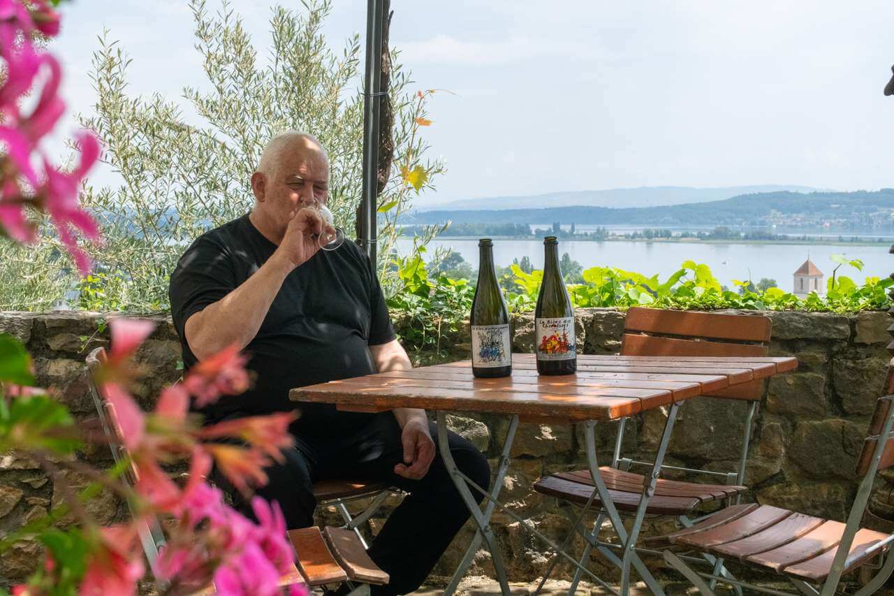 Ein Vormittag am Nordufer des Bielersees, die Sonne scheint auf die Reben, einzelne Wolken ziehen langsam über den Himmel. Oberhalb von La Neuveville, unter der rebenüberwachsenen Pergola des Weingutes neben dem Schloss, sitzt Markus Petrig, raucht einen Zigarillo und telefoniert.